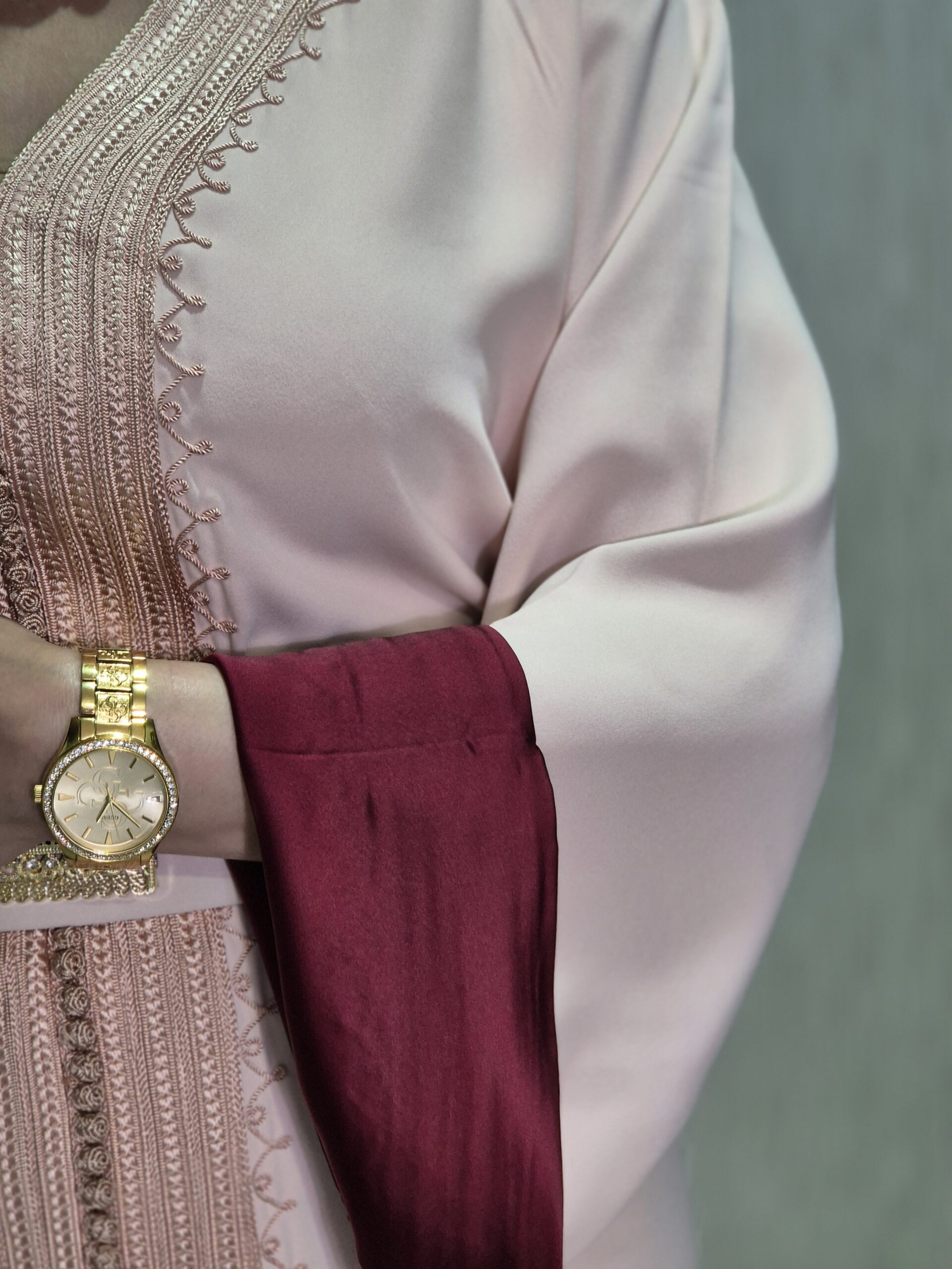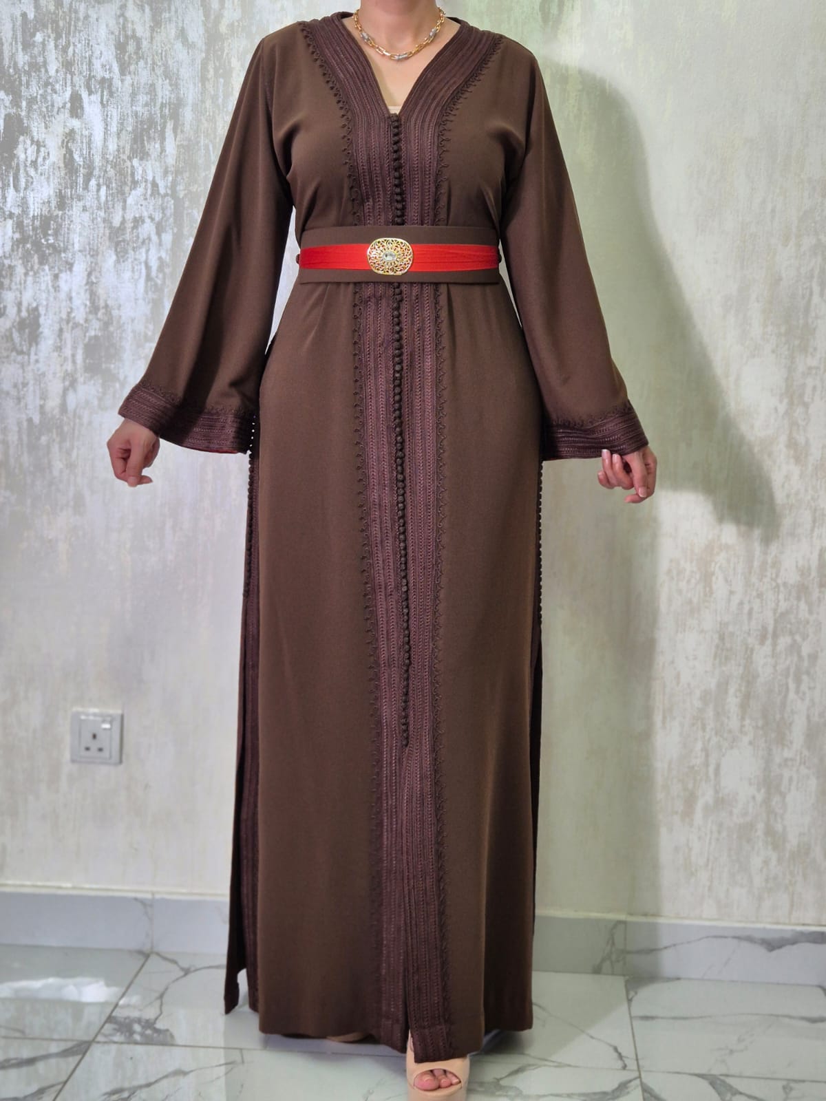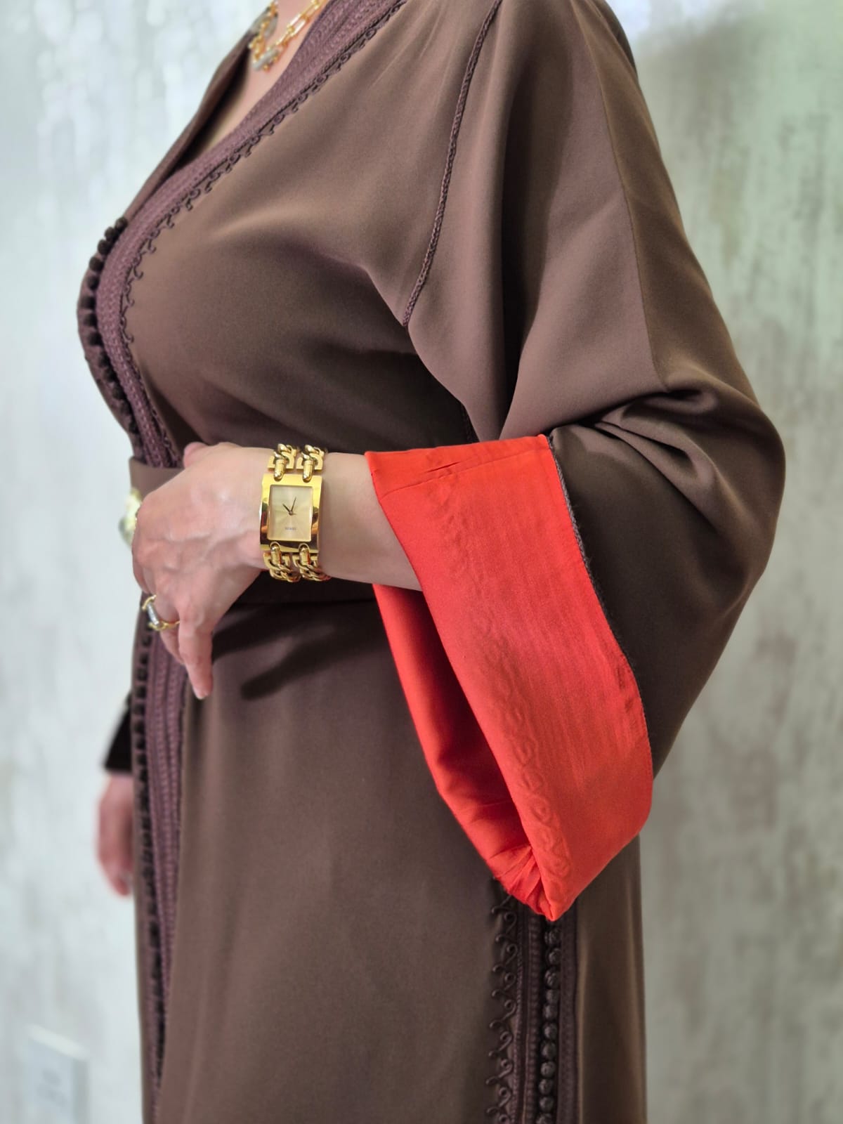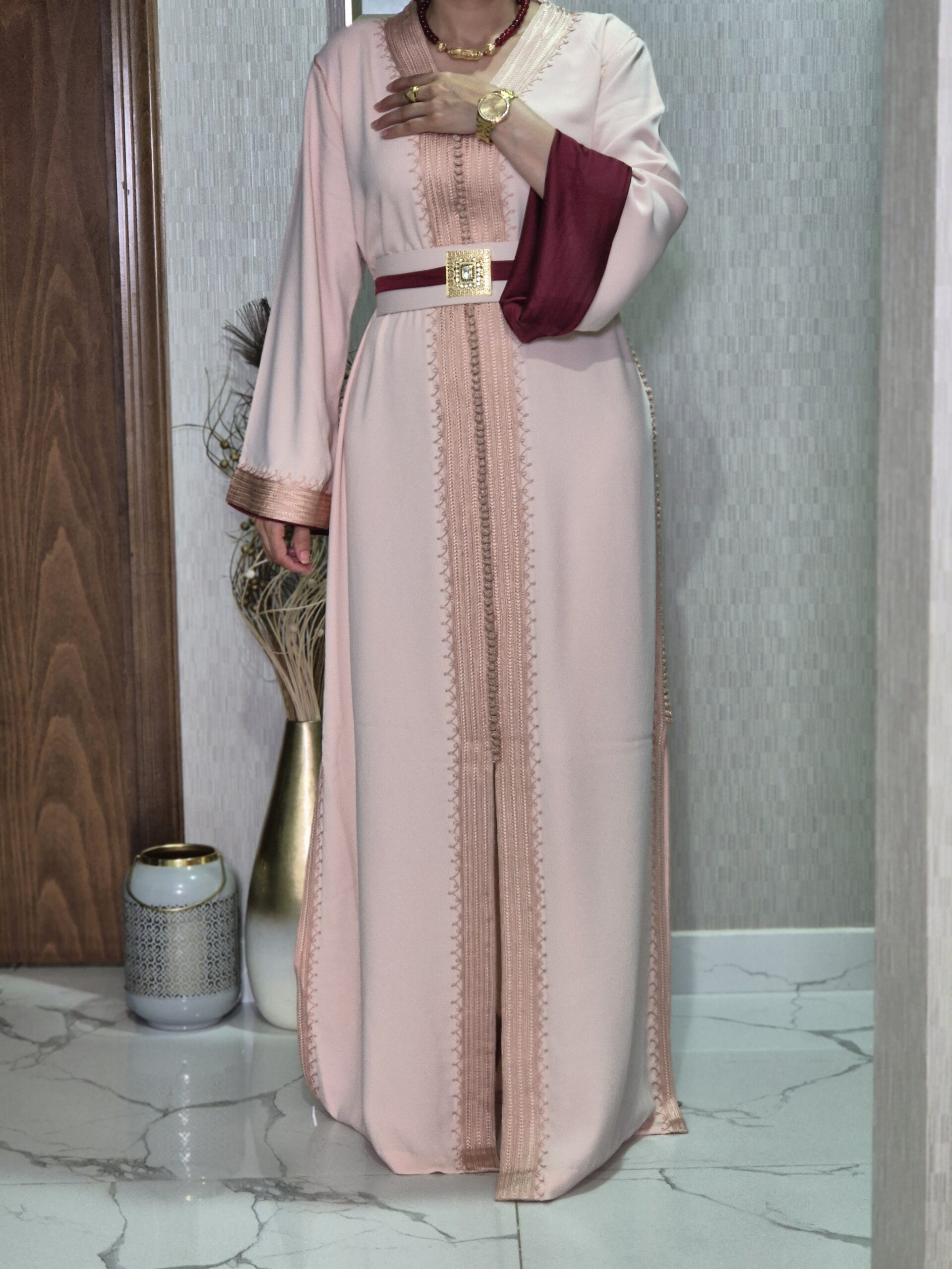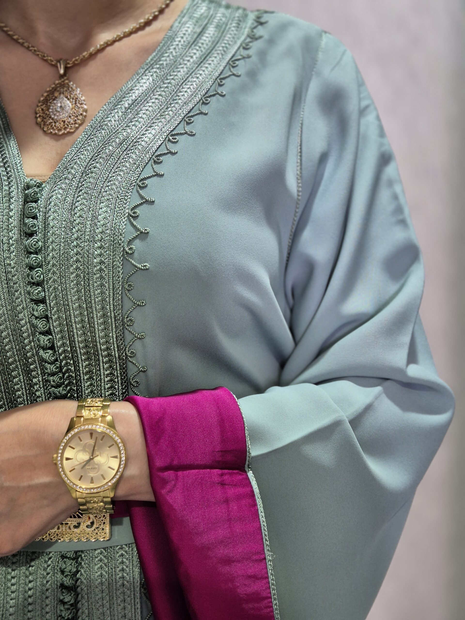 - A caftan made of silk crepe is a great choice of style and comfort, as it combines the lightness and fluidity provided by silk and the unique design offered by crepe. Sewing a caftan in the same color adds a touch of harmony and beauty, making it suitable for special occasions or family gatherings. As for the padded sleeves, they add a dimension of luxury and delicate details that show the craftsmanship of tailoring and design art. This caftan can be worn with simple accessories to highlight its natural beauty, and it suits different tastes thanks to its variety in design and colors.